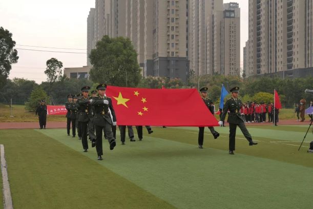 入场式结束后,举行了庄严的升旗仪式,伴随着雄壮的国歌乐曲,五星红旗冉冉升起。随后,蒋国南校长致开幕词,对辛勤筹备本届运动会的体育组等工作人员表示感谢,对各位运动员和裁判员致以亲切问候。蒋校长强调了校运会对于学校教育教学以及学生身心发展的意义,并希望全体裁判员公正裁决,严守规程,热情服务;希望全体教师坚守岗位,忠于职守,保障安全;希望全体同学文明观赛,积极参与,热情喝彩;更希望全体运动员发扬更高、更快、更强的奥运精神,尊重规则,尊重裁判,尊重对手,安全参赛、文明参赛,规范参赛,赛出斗志,赛出水平,赛出风采,取得体育运动成绩和精神文明双丰收。